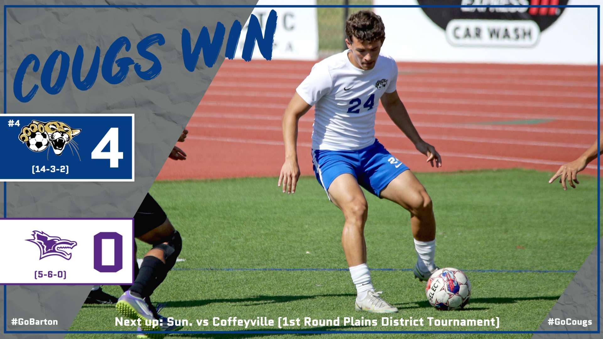 Winners of eight straight, the Cougars close the regular season at 14-3-2, while the Coyotes fall to 5-6-0 on the year. Securing the No. 2 seed in the Plains District Tournament, Barton will host No. 5 seed Coffeyville Community College in next Sunday's opening round, with time and location still to be determined due to ongoing construction at the Cougar Soccer Complex.
