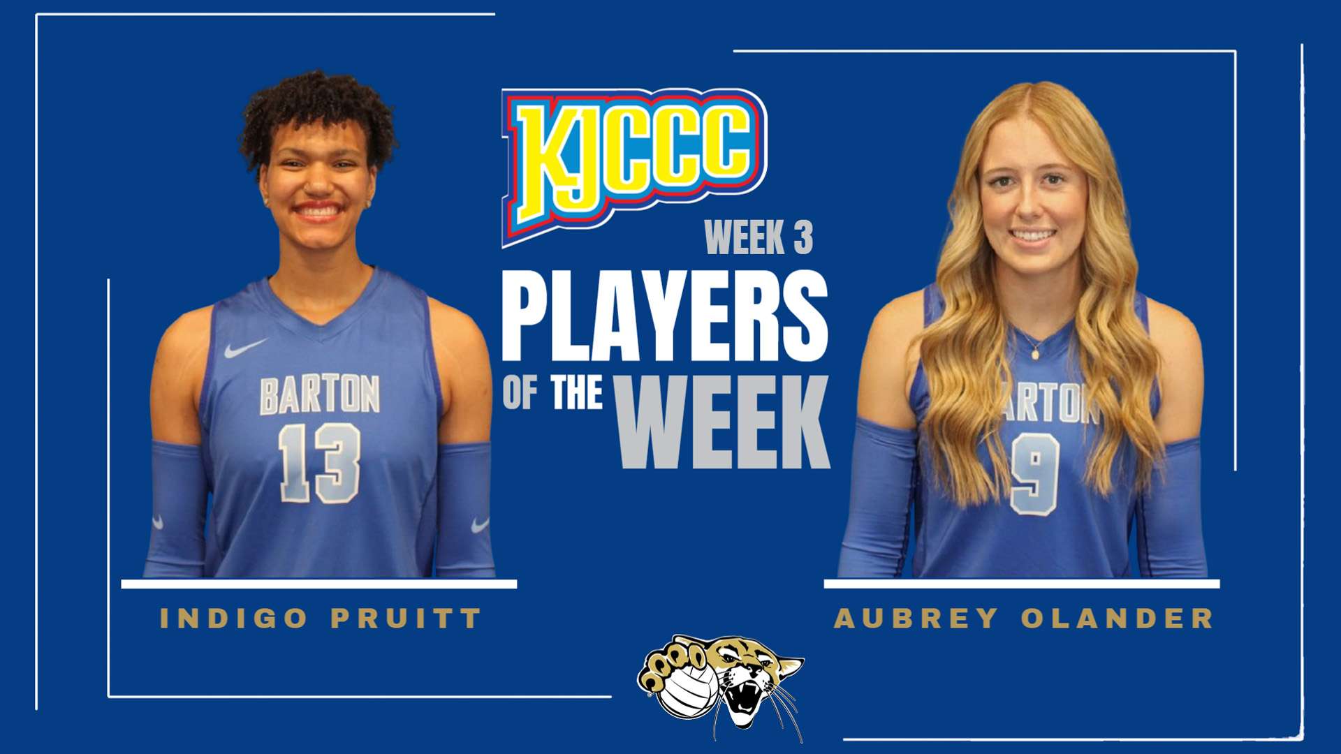 Indigo Pruitt and Aubrey Olander of the 3rd ranked Barton Community College volleyball team have been selected for week three Division I honors distributed the Kansas Jayhawk Community College Conference.