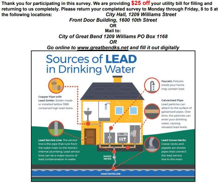 Thursday, Aug. 31 is the last day to receive a $25 credit on your utility bill in Great Bend for filling out a lead and copper survey. The Environmental Protection Agency (EPA) wants a nationwide inventory of water services, making sure all lead and copper water pipes are replaced.