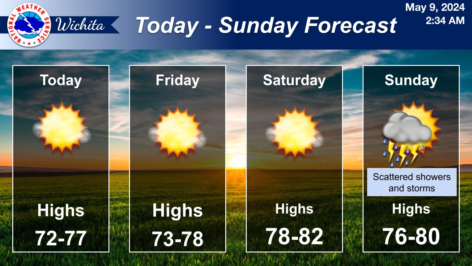 A 20 percent chance of rain and thunderstorms. Mostly sunny, with a high near 79.