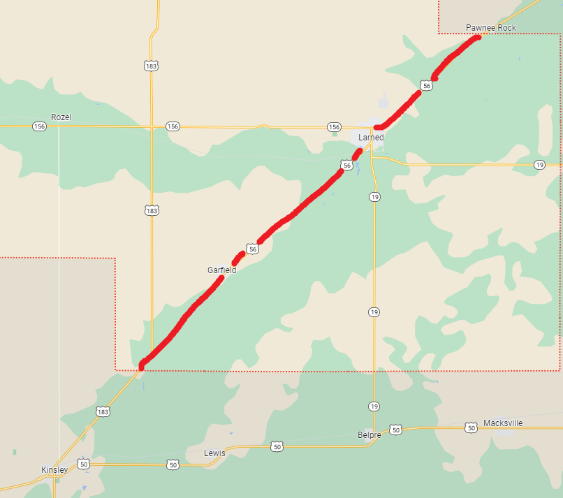 - U.S. 56 in Pawnee County: from the Edwards/Pawnee county line to the west city limits of Larned and from the east city limits of Larned to the west city limits of Pawnee Rock. The length is almost 23 miles.
