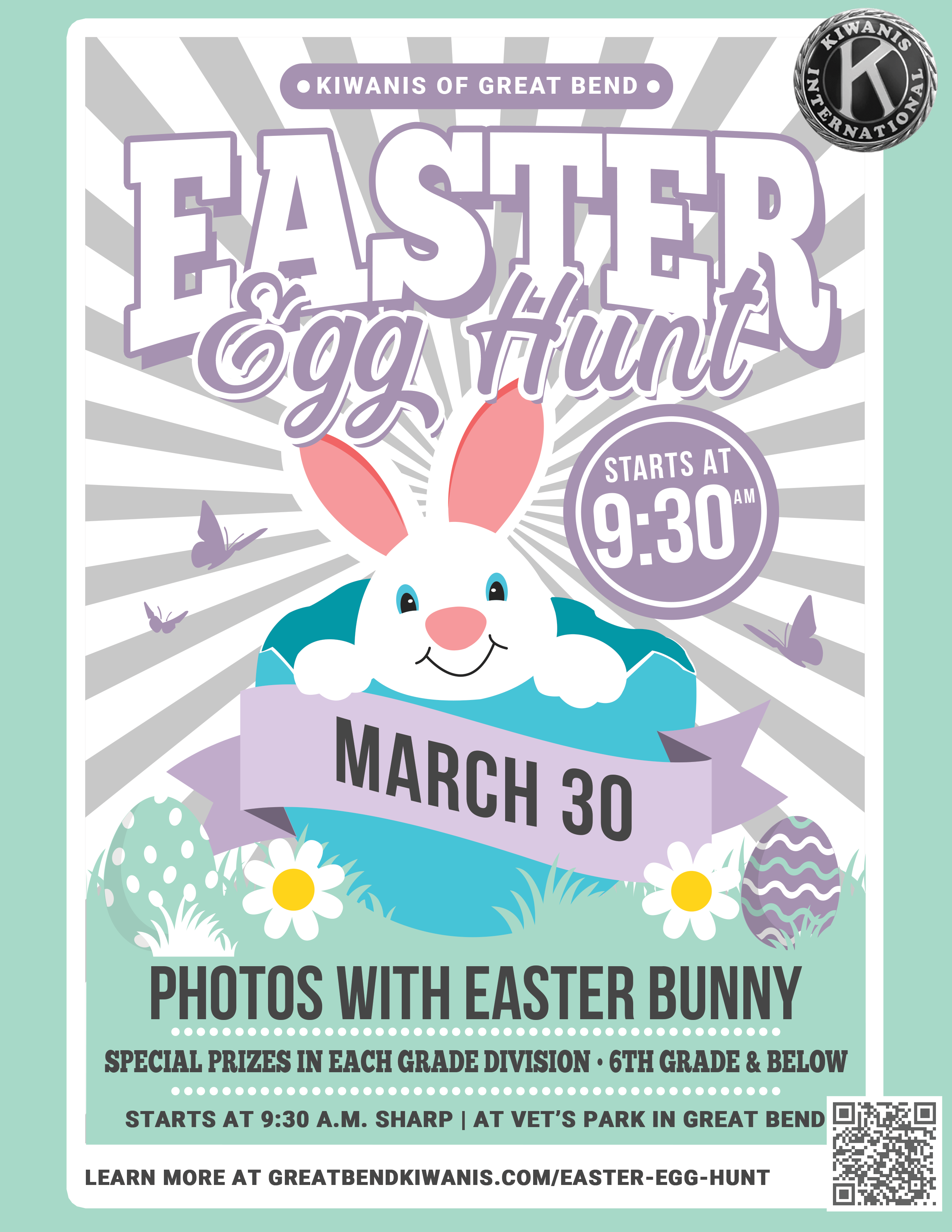 The annual Easter Egg Hunt sponsored by the Kiwanis Club of Great Bend is set for 9:30 a.m. sharp, Saturday, March 30. The hunt will be at the Kiwanis Walking Track on the north side of Veterans Memorial Park, just off McKinley Street in Great Bend.