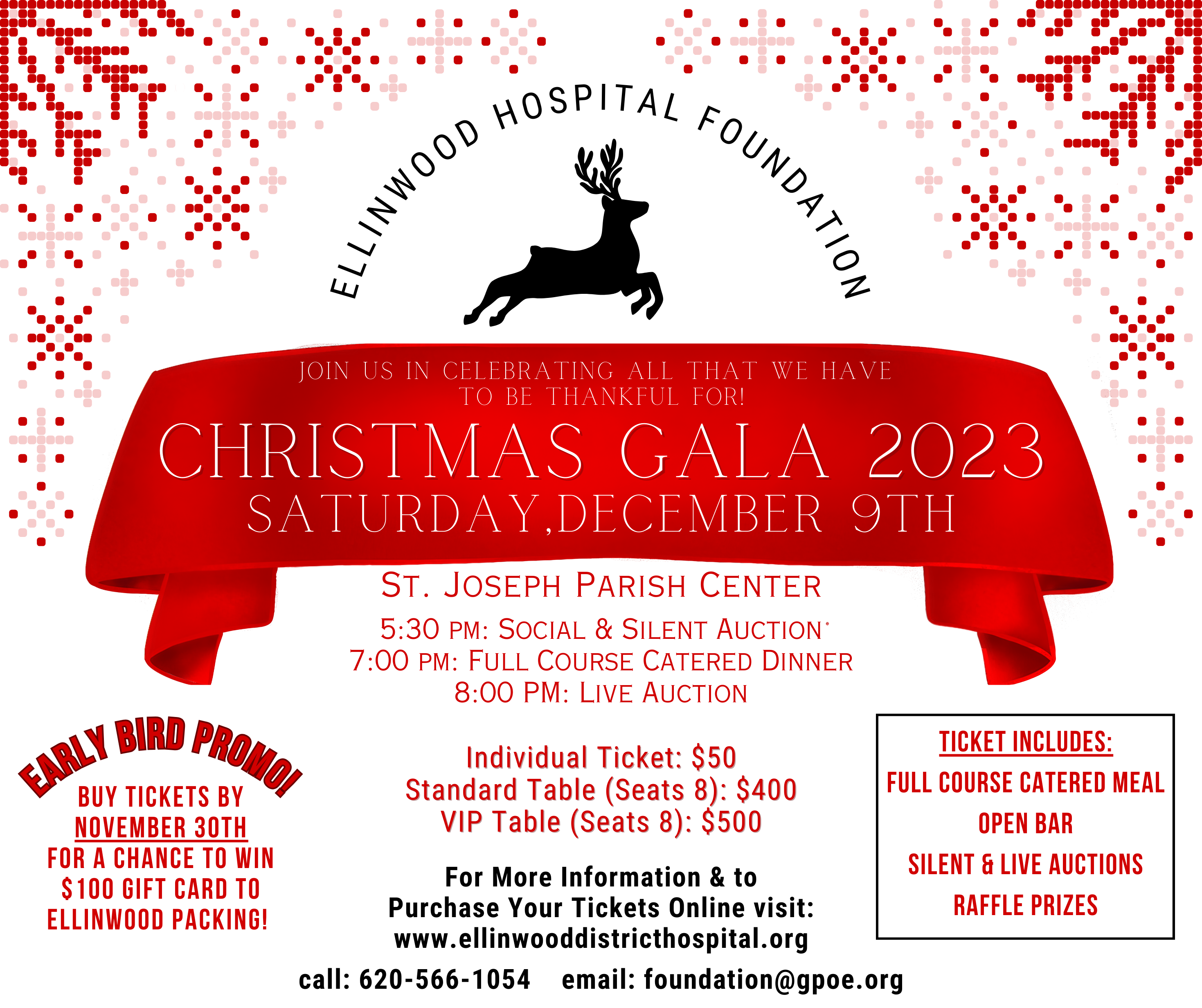 Ellinwood Hospital Foundation will be hosting it’s Christmas Gala this year on the evening of Saturday, December 9th. The Gala is an annual event and is the Foundation’s largest fundraiser for the Hospital & Clinic. With construction currently underway on the new Hospital & Clinic and an expected open date of August, 2024 all proceeds from this year’s gala will go towards furniture and equipment for the new facility.