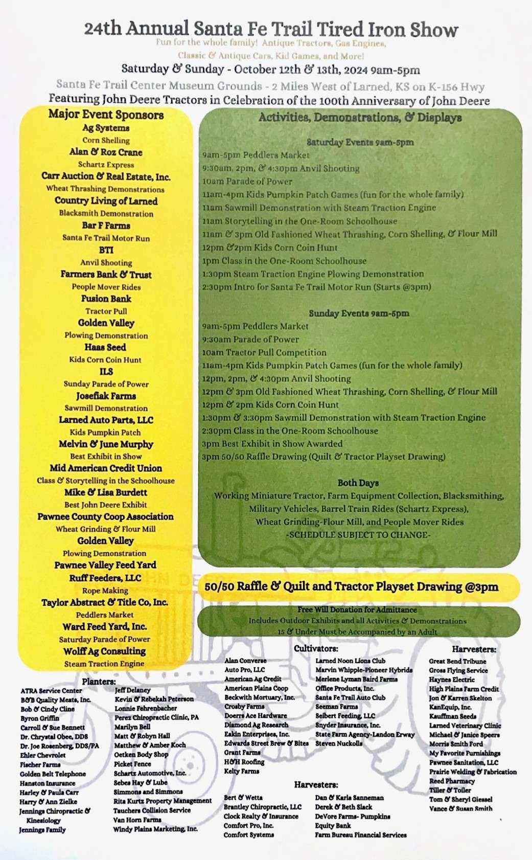 Attention all John Deere Fans - come to the Santa Fe Trail Center in Larned on Saturday, Oct. 12 and Sunday, Oct. 13 and enjoy a family-friendly environment. There will be anvil shoots, antique tractor parades, tractor pulls, food trucks, collectibles and crafts and many farming demonstrations.