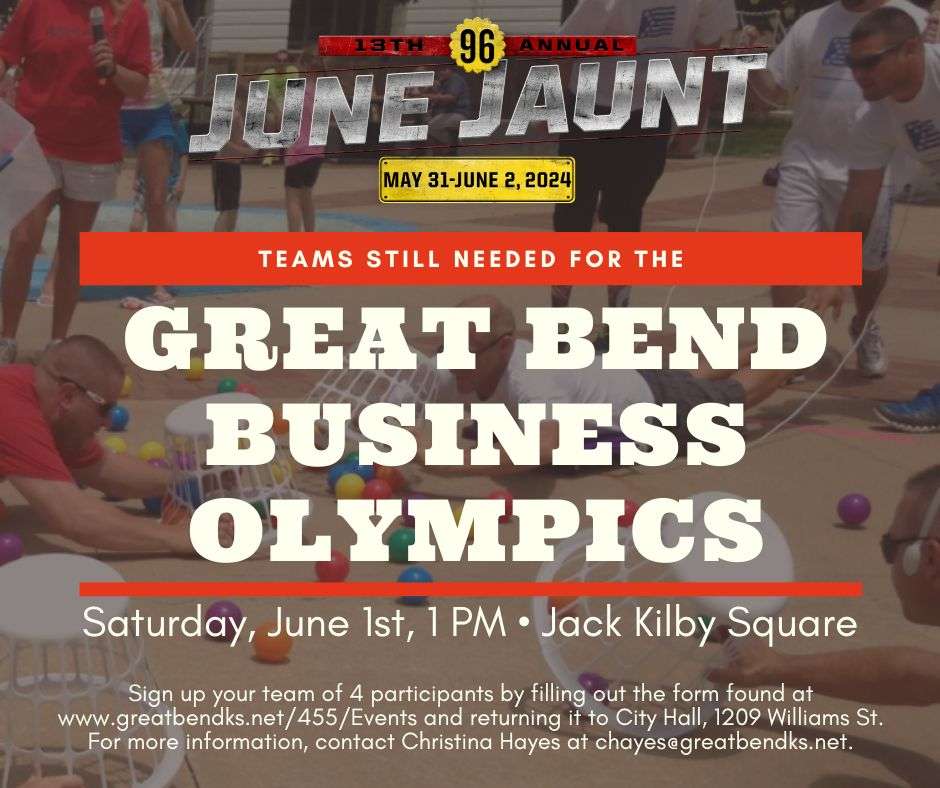 The city of Great Bend is ready for you and your family or business team to sign up for the 2024 Great Bend Business Olympics. Get your team together and join in the fun. Get your form here.