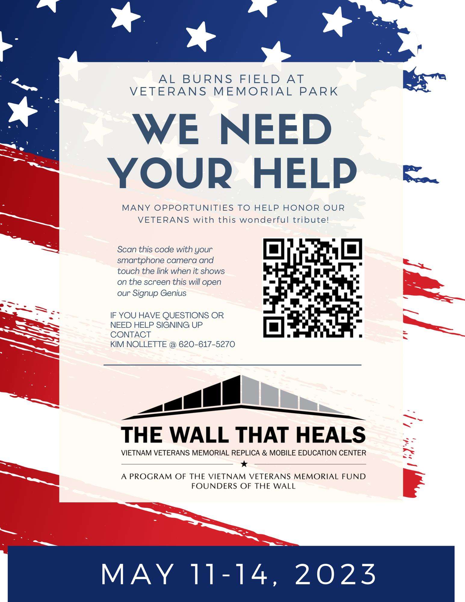 The City of Great Bend needs you. To help pay a wonderful tribute to the Vietnam Veterans in our community, the city is seeking volunteers to assist when the "Wall That Heals" memorial arrives in May.