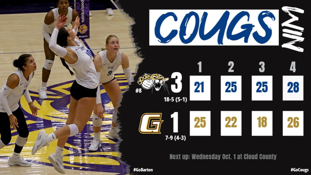 Barton's middles combined for 19 kills on .485 hitting with nine total blocks. Sophomore Aubrey Olander was nearly flawless at .562 with 10 kills and five blocks, while freshman Indigo Pruitt contributed nine kills on .421 efficiency with four blocks.