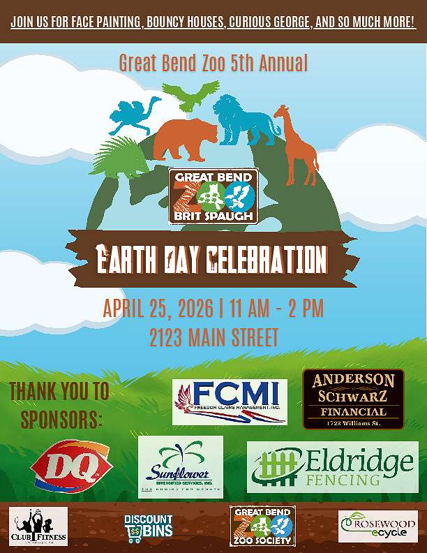 Celebrate our planet during the 5th Annual Earth Day Celebration on Saturday, April 25th at the Brit Spaugh Great Bend Zoo, 2123 Main in Great Bend. Stop by from 11 a.m. until 2 p.m. and enjoy the many come-and-go family-fun events. Great Bend Earth Day will also emphasize the importance of conservation and recycling to protect our environment. Enjoy face painting, bouncy houses, a visit with Curious George and more. For additional information, call 620-793-4226, or send an e-mail to: zoocurator@greatbendks.net.