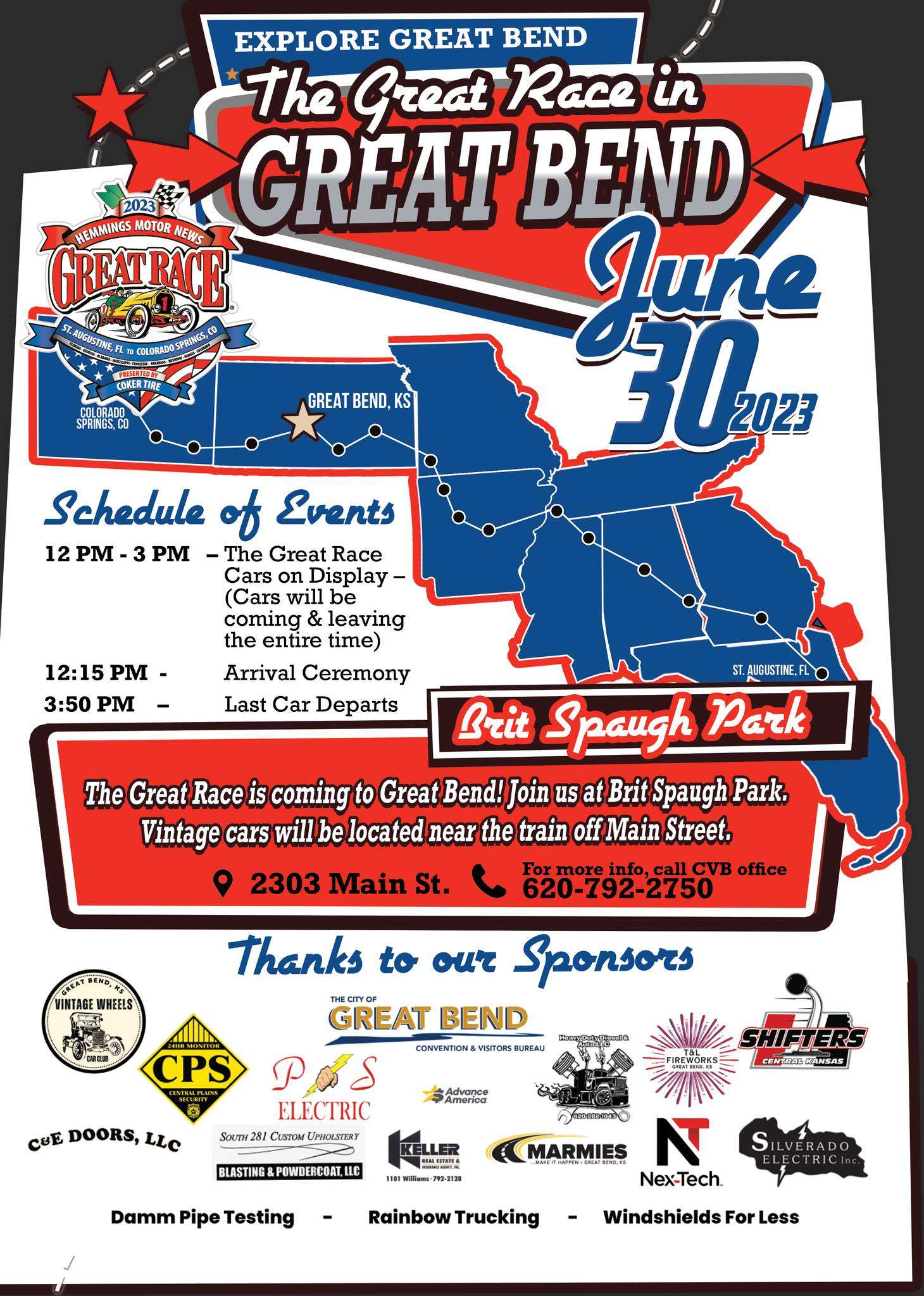 The Indianapolis 500 gained fame, in part, because of its 500 miles of racing. That pales in comparison to the Great Race that will make a pit stop in Great Bend next Friday, June 30. Many vintage cars will make the stop on the back end of their 2,300-mile race across half the country. Great Bend Convention and Visitors Bureau Director Christina Hayes is excited to welcome them in.
