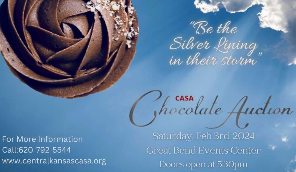 The 19th Annual CASA Chocolate Auction begins at 5:30 p.m. on Feb. 3 at the Great Bend Event Center. Single tickets begin at $60 and may be purchased online or by calling the Central Kansas CASA office at (620) 792-5544. Email is currently unavailable.