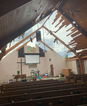 Of all the damage caused by the July 16 storm that ripped through Great Bend, perhaps none was more notable than roof damage to First Southern Baptist Church across from the Great Bend Middle School at 19th at Harrison. Strong winds ripped the roof from the building, and the hail and run that followed caused more damage inside. Pastor Tim Singleton said progress continues to reopen the church.