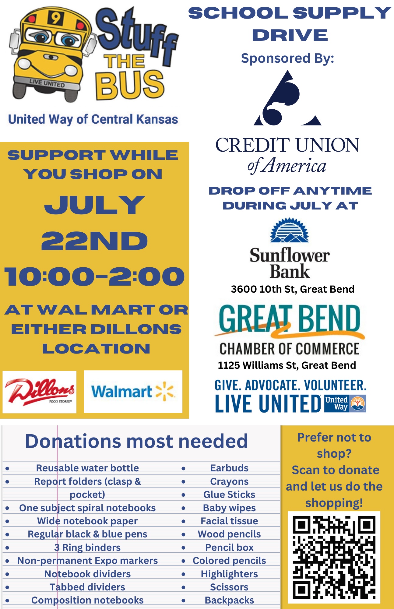 · Drop off donations through the month of July at Sunflower Bank (3600 10th St) or the Great Bend Chamber of Commerce (1125 Williams).