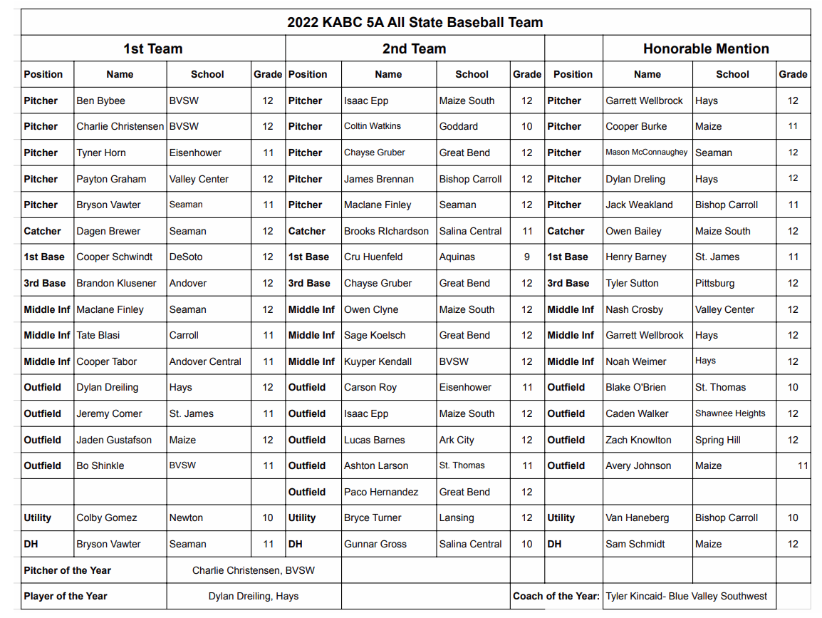 The Great Bend High School baseball team had three players earn a spot on the 2022 Kansas Association of Baseball Coaches (KABC) 5A All State Team.