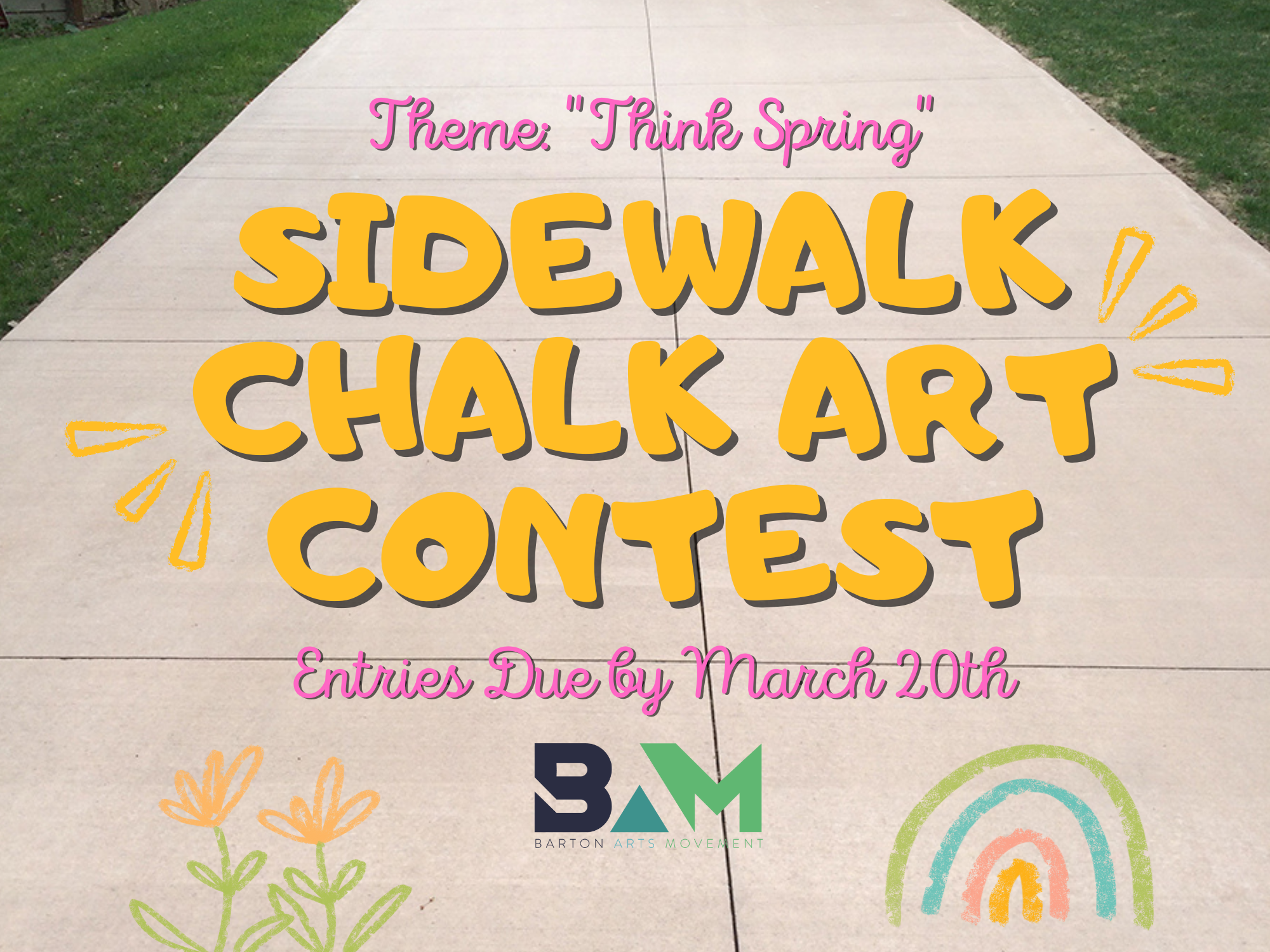 Barton Arts Movement is thrilled to announce a Sidewalk Chalk contest for artists of all ages in Barton County! The competition offers prizes for three age groups, and a grand prize of $250 in gift certificates for the overall judge's choice winner! Deadline to enter is. March 20, 2023. "We did a similar contest in the summer of 2022, and it was a huge hit!