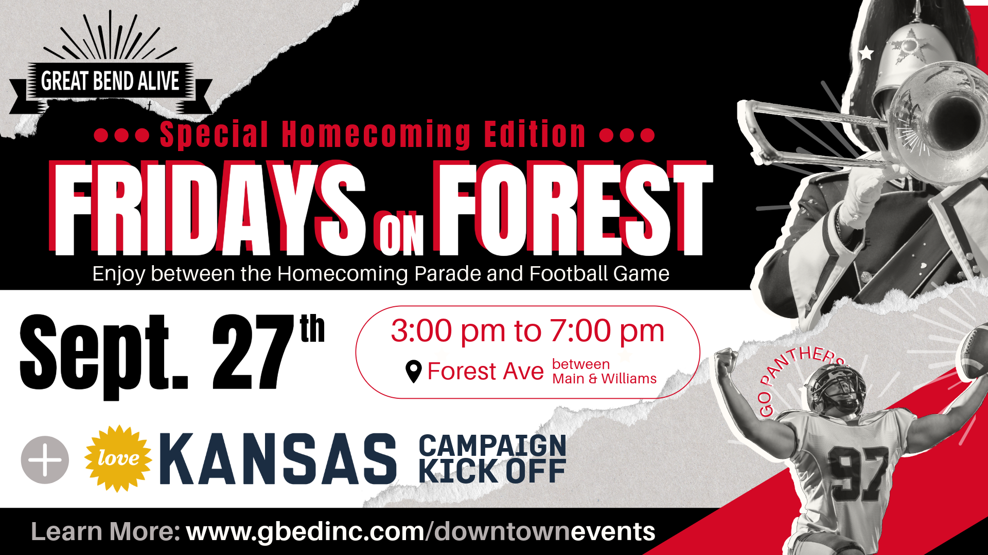 Great Bend Alive, part of Great Bend Economic Development, is hosting a special edition of Fridays on Forest on Sept. 27, timed between the Great Bend Homecoming Parade and the high school football game. This event, from 3 p.m. to 7 p.m. on Forest Avenue, will feature live music, food vendors like Lumpy’s, Los Dos Portillo’s, and Brand 17 BBQ, as well as drink options from Los Dos Portillo’s, Charlie’s Place and Dry Lake Brewing. This homecoming-themed event aims to capture the excitement of the parade while promoting the Love, Kansas campaign—a statewide initiative to attract new talent and showcase Kansas as a great place to live and work.