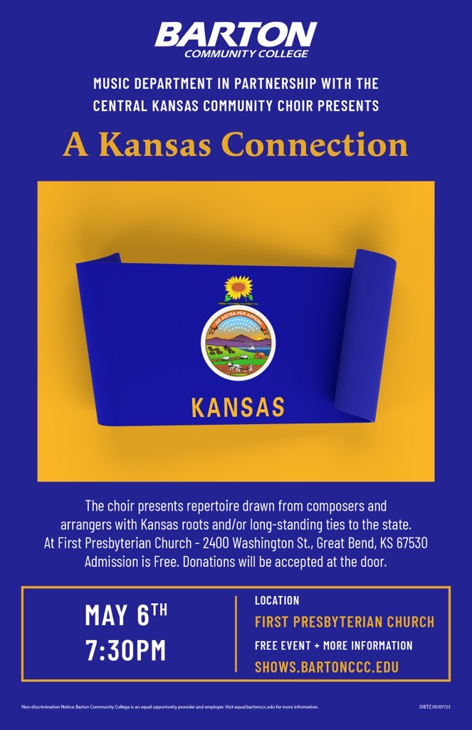 The Barton Music Department, in conjunction with the Central Kansas Community Choir, will present the “Kansas Connection,” concert featuring music from the Heartland by Kansas composers at 7:30 p.m. May 6 at the First Presbyterian Church, 2400 Washington St., Great Bend.