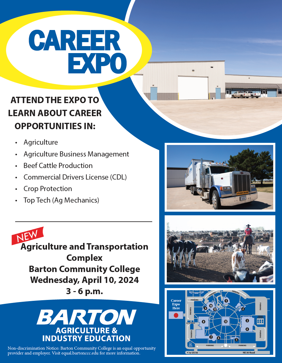 Barton Community College’s Agriculture department invites interested students to learn about career opportunities at the Career Expo from 3 p.m. to 6 p.m. on April 10 in the new Ag and Transportation Complex.