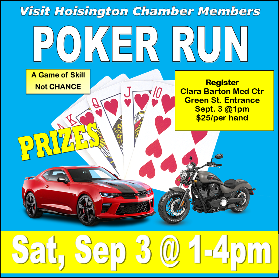 The poker run stays local to promote area businesses. This year's run is from 1 to 4 p.m. with a starting point at Clara Barton Hospital. Other stops include Cardinal Lanes, Duck Blind, Mi Tierra Restaurant, the American Legion, Tap Room, and Knights of Columbus. The party bus will also be available Saturday evening for a small fee.