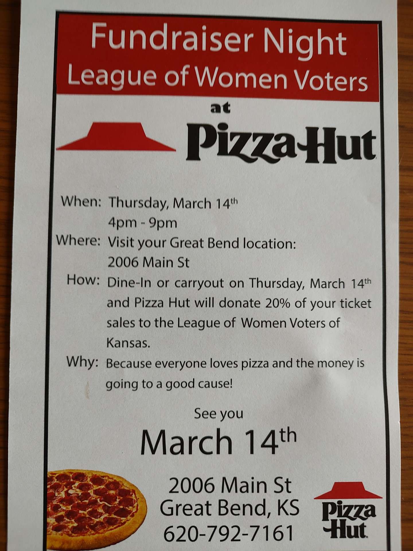 The Great Bend League of Women Voters is having a fundraiser at the Great Bend Pizza Hut on March 14.
