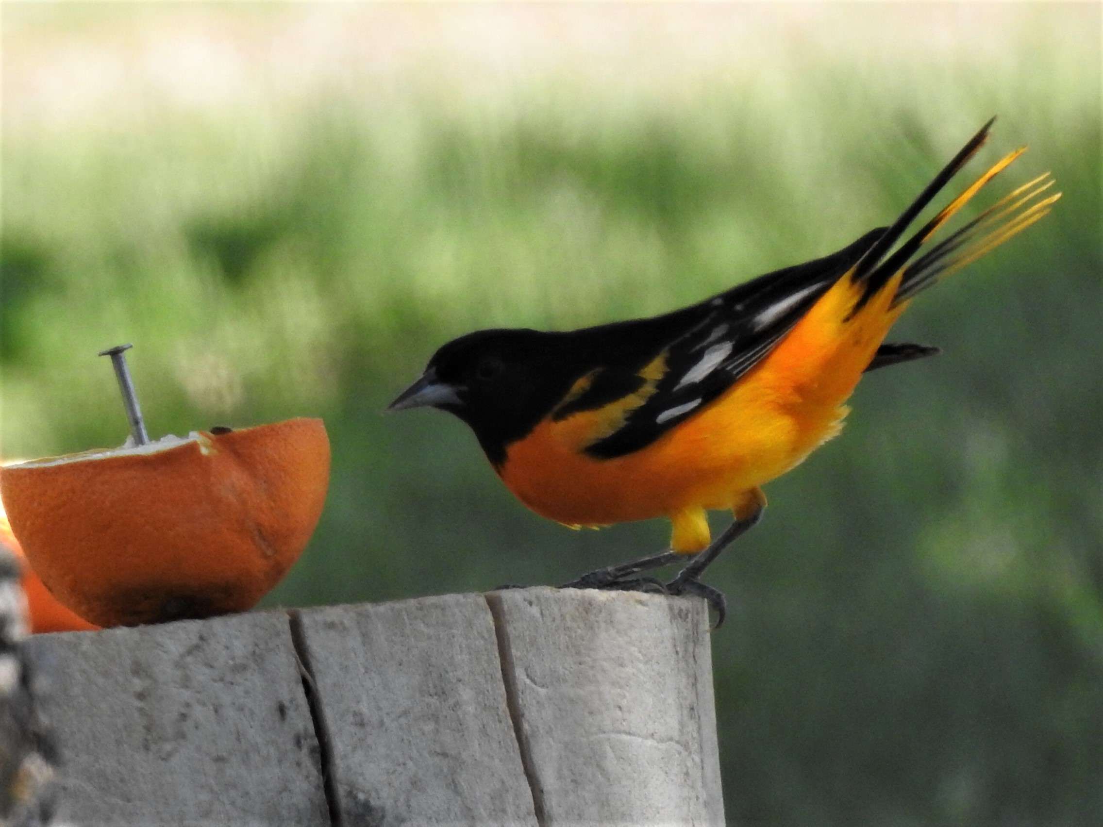 The detail about oranges gives pause to fruit growers. As summer advances, orioles add fruit to their diet of creepy crawlers. For those making fruit jellies, cobblers, and pies, simply trim bird pecks in peaches, apples or tomatoes. Unfortunately, these invasions alarm fruit sellers so don’t hang feeders near an orchard.