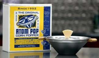Made in Bushton, the Atom Pop is a stove top popcorn popper. It makes 2 1/2 quarts of popped corn. The conical shape and aluminum bowl allow the popcorn to be popped without stirring or shaking. Popped kernels are pushed up away from the heat and the aluminum dissipates the heat so the corn does not burn. It is as convenient as microwave popcorn and is healthier without the additives.