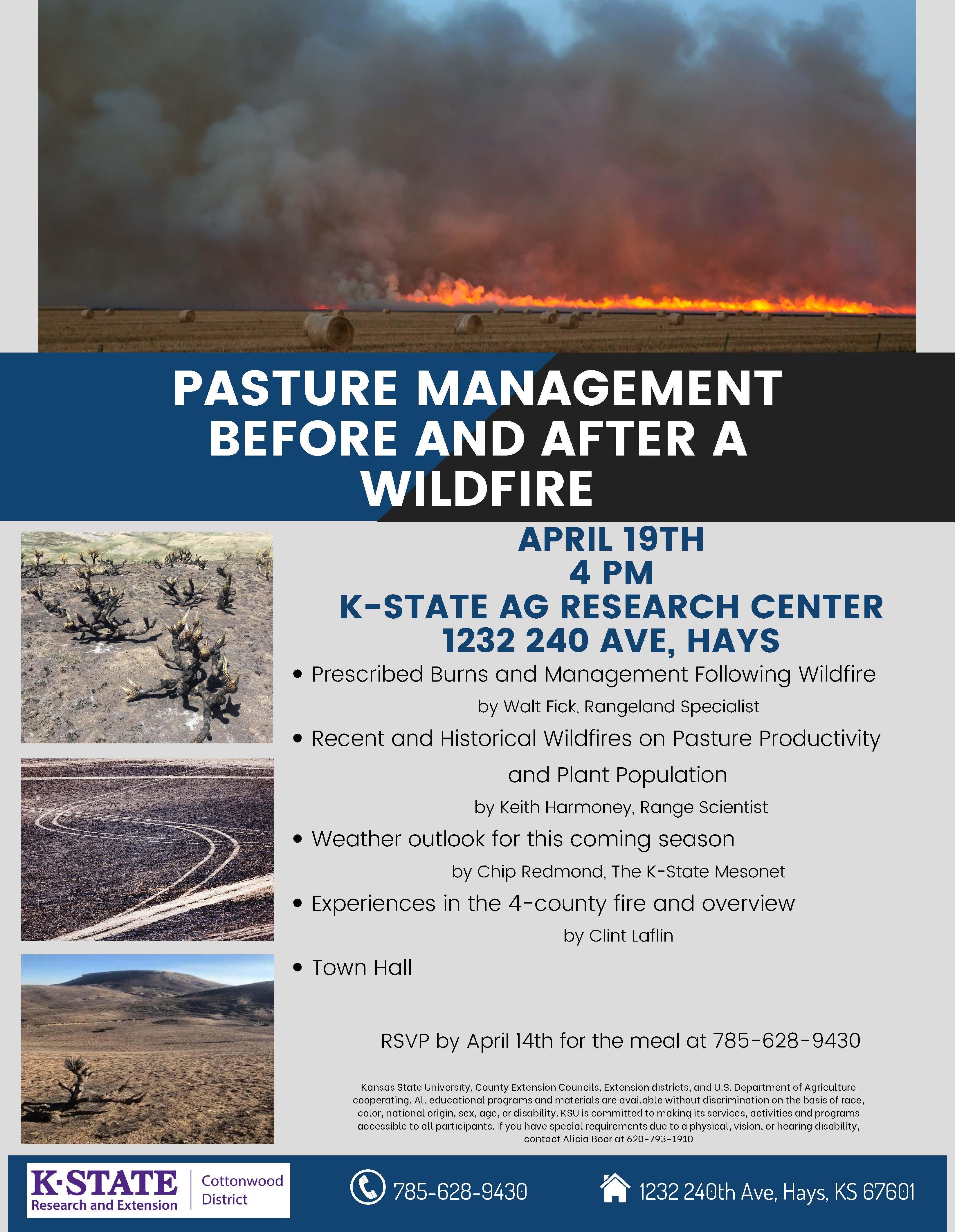 On Tuesday, April 19 beginning at 4 p.m. at the Agricultural Research Center – Hays. The Cottonwood, Midway and Post Rock Extension Districts will be hosting a Pasture Management Before and After a Wildfire program.