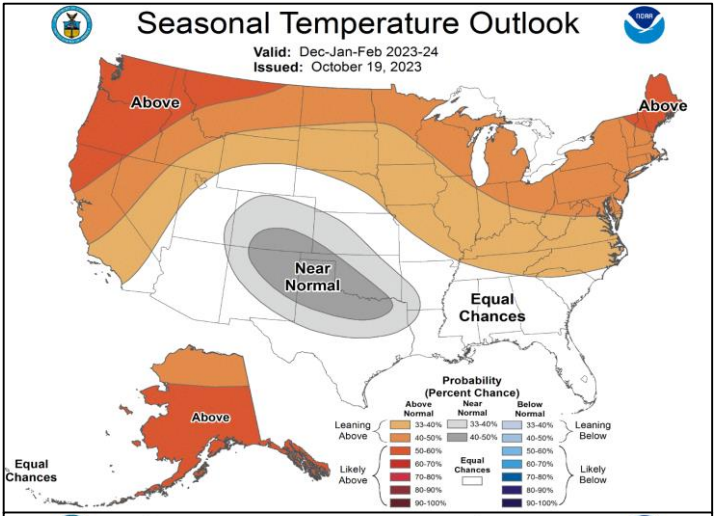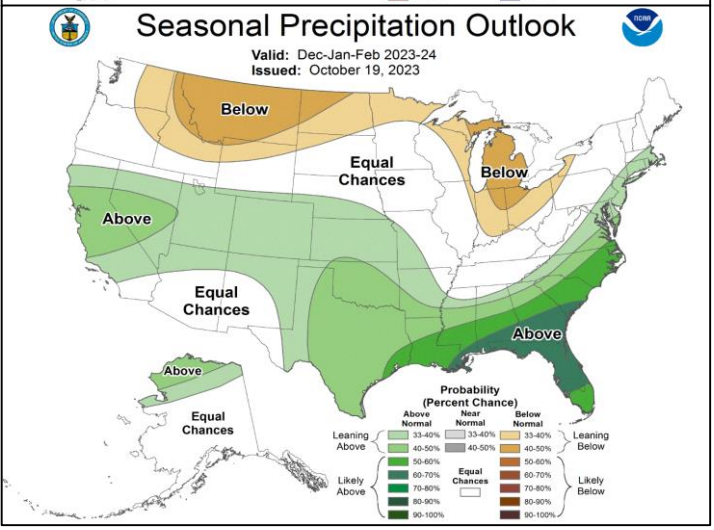 The report indicated some spots in Kansas saw 150-300 percent above-normal precipitation amounts from August through October, while most areas, including south-central Kansas, saw well below normal averages. Some saw only 25 percent of normal rainfall totals in that span. Hayes said along with better chances of moisture in the next few months, the temperature should remain normal.