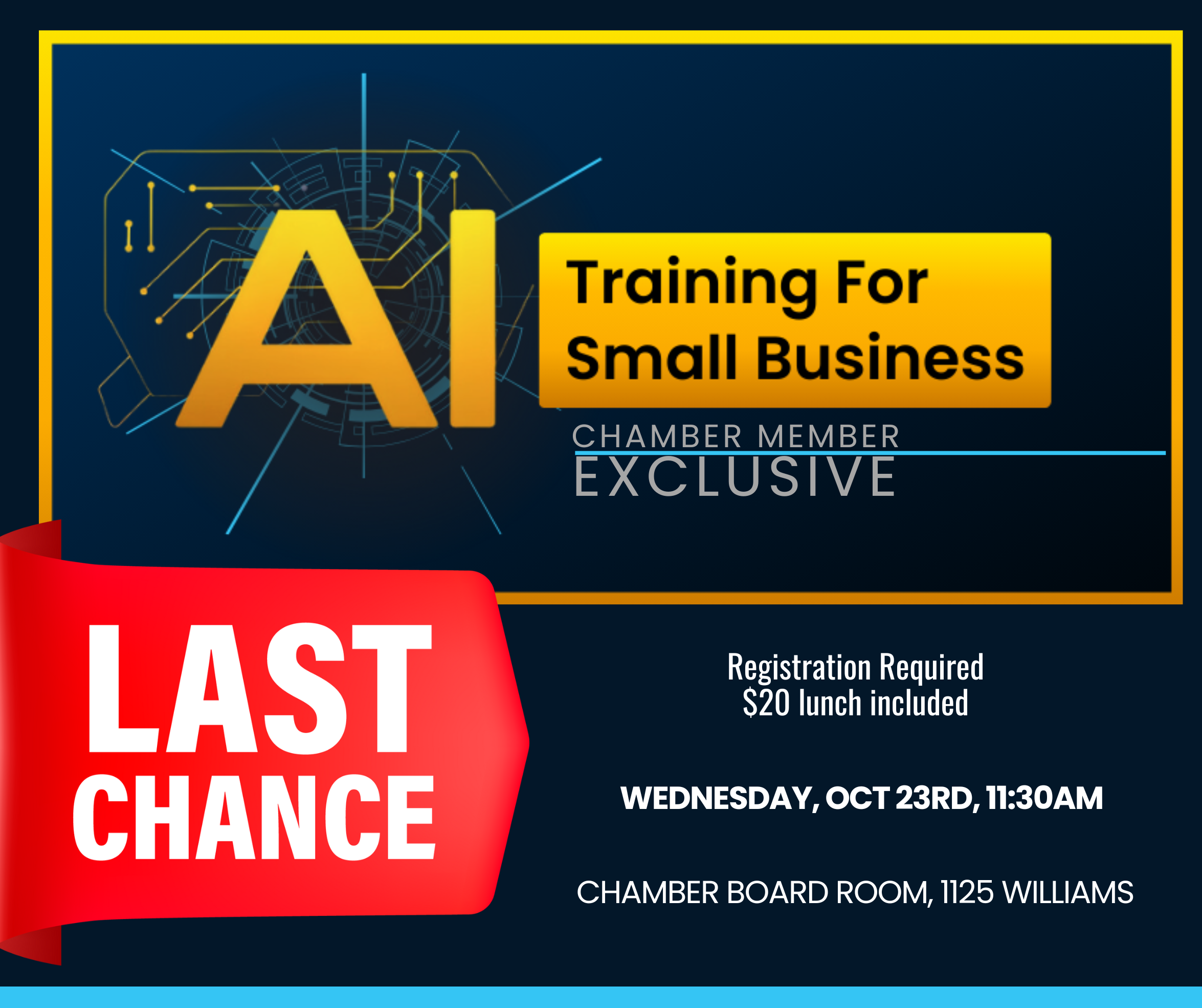 The Great Bend Chamber of Commerce is offering a unique opportunity to transform your business with the power of Artificial Intelligence. Join the Chamber on Wednesday, Oct. 23 at 12 p.m. for a 90-minute webinar crafted specifically for small business owners who want to stay ahead of the curve. Lunch will be provided. Registration is required. The cost is $20 per person.