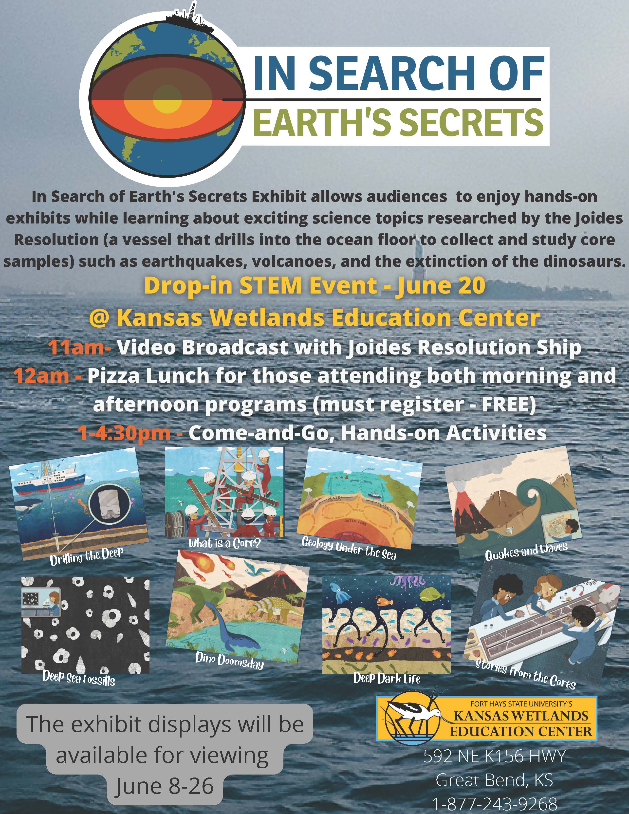 The Kansas Wetlands Education Center (KWEC) is hosting the "In Search of Earth's Secrets" exhibit for public viewing from June 9-26, 2022. Special activities will be held June 20. All activities are free to the public.