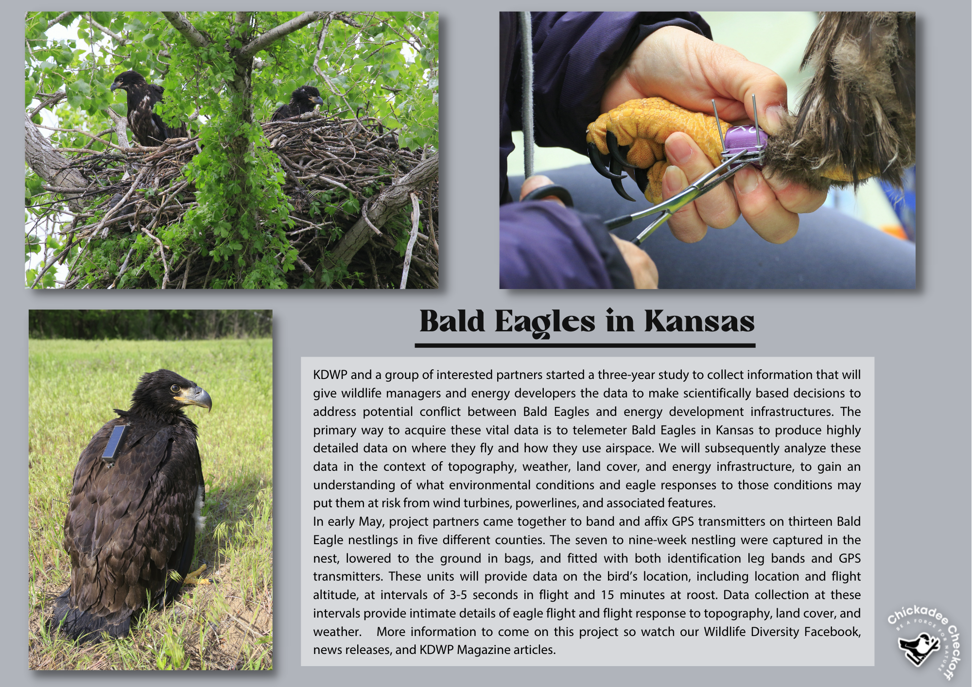 In the spring of 2021, a research study on the ecology of Kansas-hatched bald eagles (Haliaeetus leucocephalus) began with just 13 birds and plans of field work lasting three years. This year – thanks to voluntary contributions made to the Kansas Department of Wildlife and Park’s nongame species donation program, Chickadee Checkoff – that research project has been extended; and, the total number of birds studied has increased to nearly 30 bald eagles.