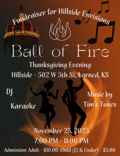 The holiday season in Larned begins with the lighting of the water tower on Thanksgiving, Nov. 23. Hillside Envisions wants to continue that fun into the evening with its Ball of Fire karaoke fundraiser from 7-11 p.m.
