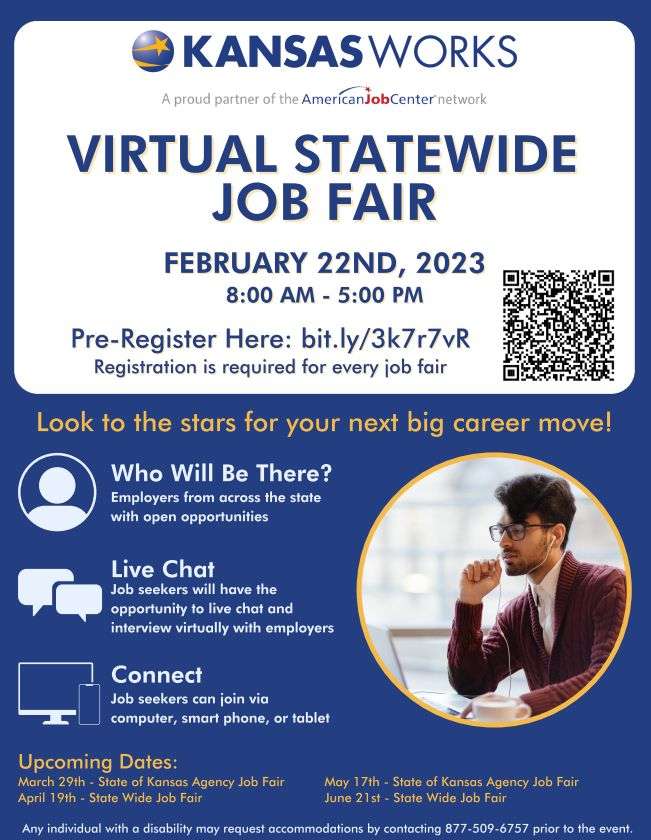 CLICK HERE to access the KansasWorks website. Job seekers and employers can click in the yellow banner to register for the Statewide Virtual Job Fair.