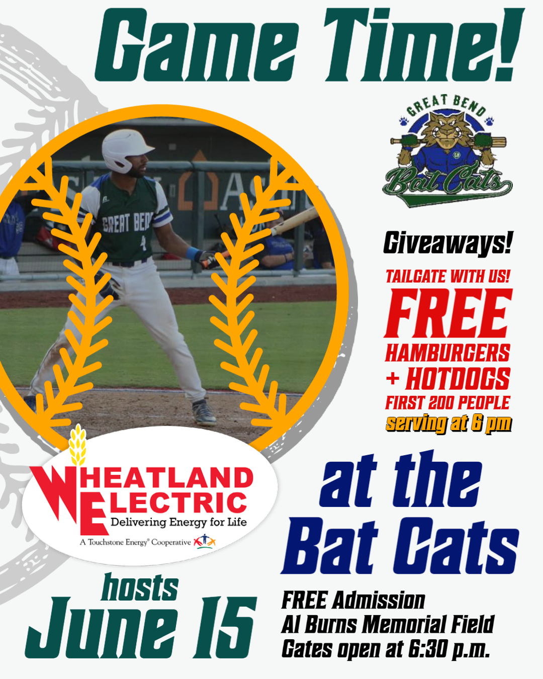 Wheatland Electric Cooperative, Inc. is inviting the local community to the Great Bend Bat Cats baseball game at Al Burns Memorial Field on June 15.