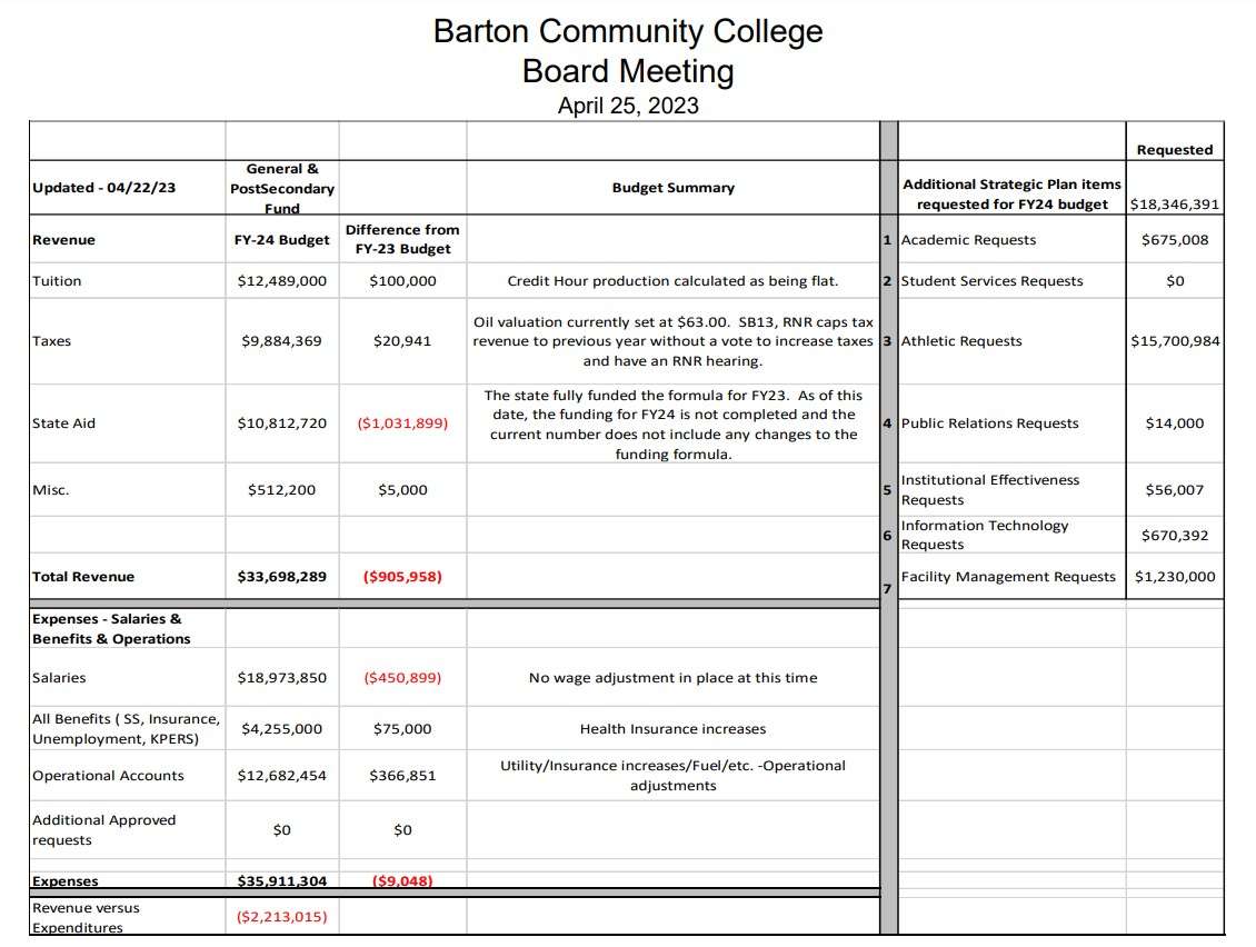 The numbers are preliminary. A lot will change over the next couple of months, but Barton Community College Vice President of Administration Mark Dean presented the college’s fiscal year 2024 preliminary budget to the Board of Trustees Tuesday. Dean showed a projected $2.2 million loss for the upcoming budget.
