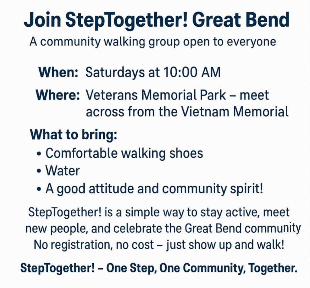 If you want to stay active, meet new people and enjoy the Great Bend community, then consider joining Step Together Great Bend, a new walking group that’s open to everyone. The group meets at 10 a.m. each Saturday at the Vietnam Memorial in Veteran’s Park. Bring comfortable walking shoes and water. There’s no cost to join. Just show up and walk.