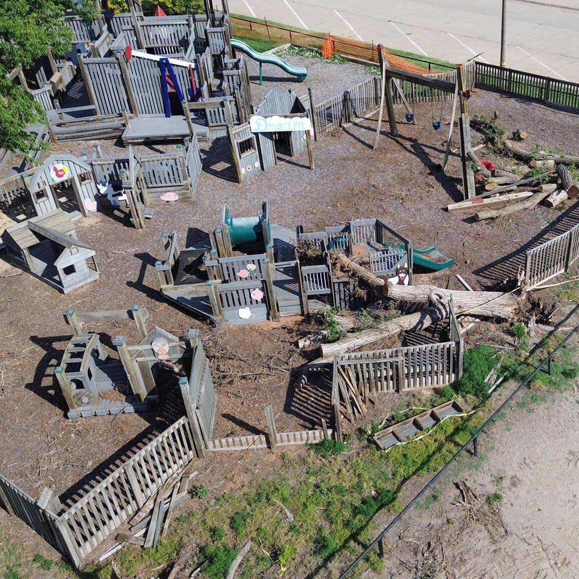 Over 20 years ago, our incredible Russell community came together to build a beautiful castle park playground in Memorial Park. Many happy hours have been spent there by area children, but now, the playground is nearing the end of its lifespan. Sadly, many of the trees surrounding the park caused damage to the park equipment during a recent storm. The park is fenced off while city crews clean up the debris.