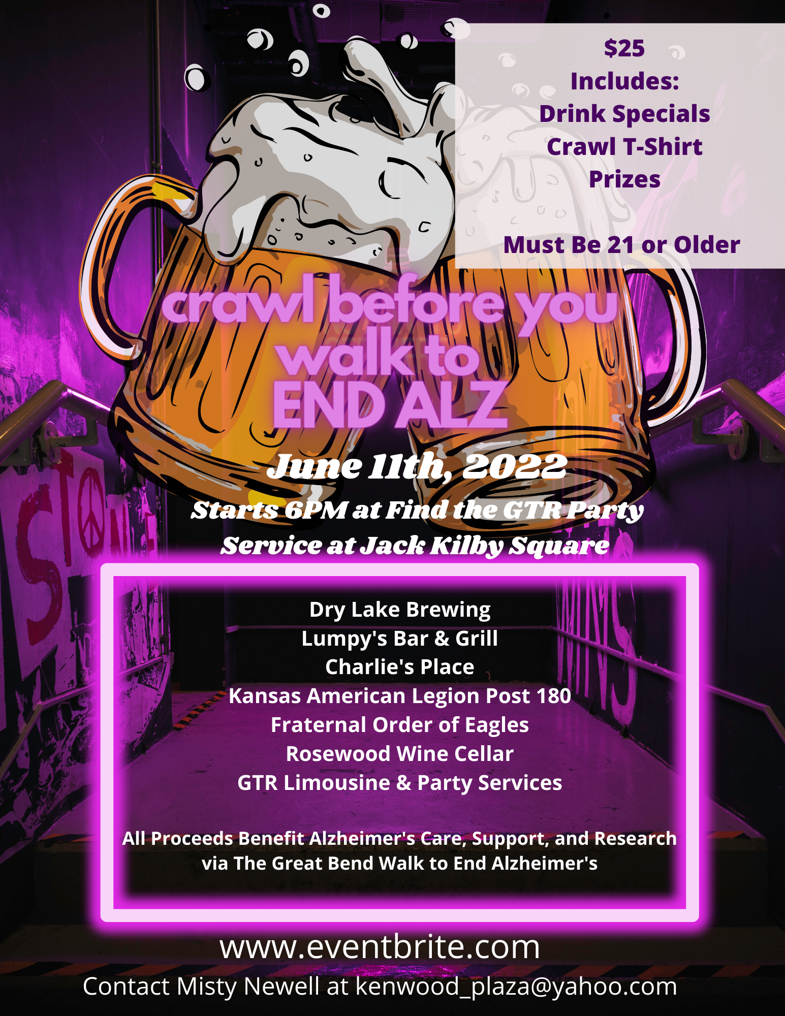 A Pub Crawl is planned for June 11 in Great Bend to raise awareness and funds for the Alzheimer’s Association Walk to End Alzheimer’s in Great Bend.
