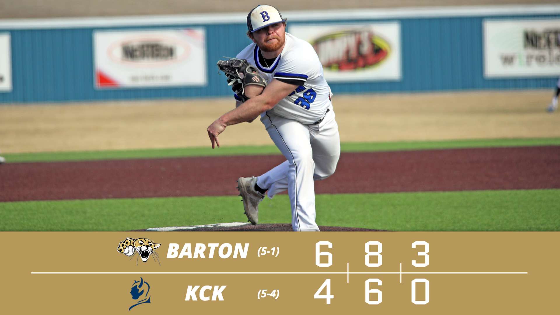 Facing a two-run deficit when coming to bat in the eighth, momentum quickly swayed back to the Barton side loading the bases with one-out behind Cesar Gomez leadoff walk, Barrett Donaldson single and Graves second walk in as many innings to flip the lineup back to the top of the order. Already with two singles on the day, Tyler Janssen's third single of the day knotted things up driving in a pair to activate three straight run producing singles with Hunter Alvord delivering the go-ahead RBI single two-pitches later and Ayden Hadley adding an insurance run with his lone hit of the afternoon driving in one.