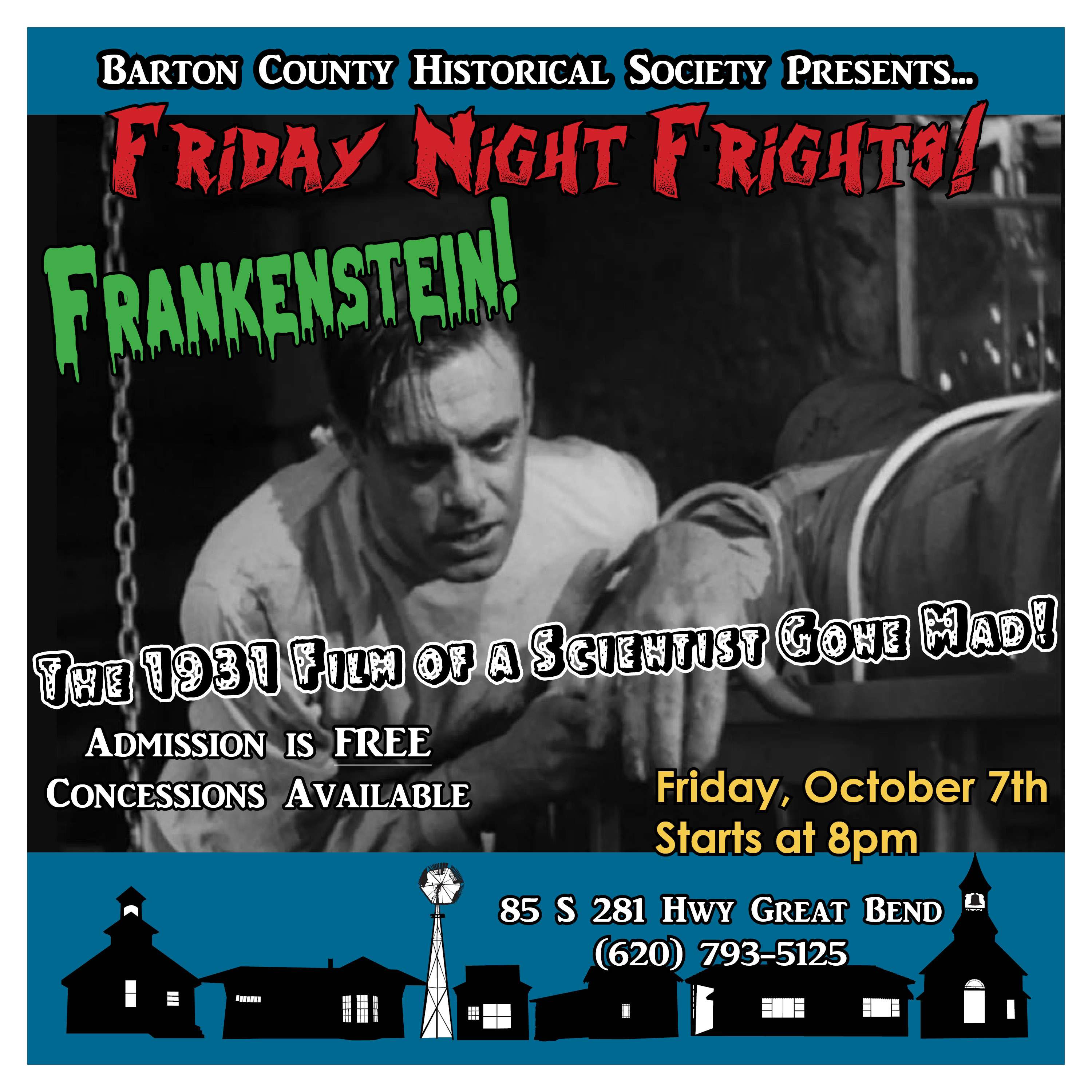 All through the month of October, the Barton County Historical Society will be presenting a classic movie monster film on Friday evenings at 8 p.m. The films will be played outside, so wear your hoodies, and bring your lawn chair or a blanket to sit on and see these black and white classics.