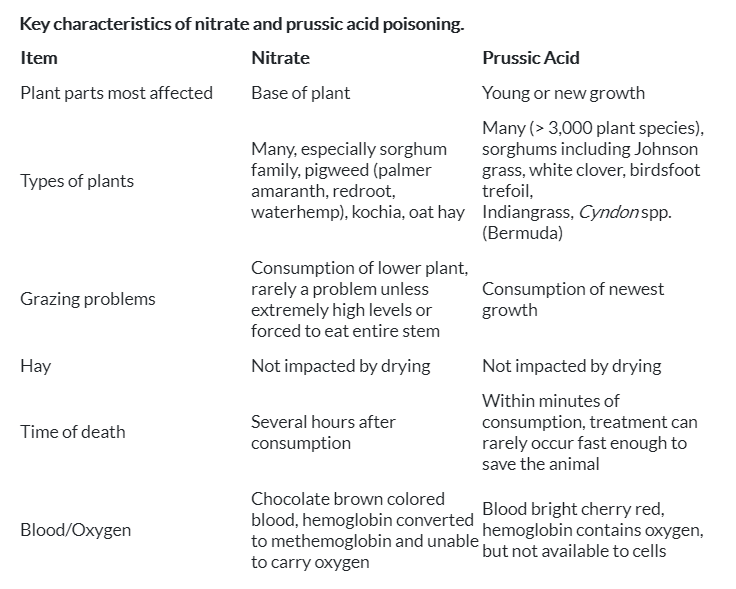 Many cattle operations rely on some type of harvested feed to use in the winter months and common among those sources is forage sorghum, millets, sorghum-sudangrass, and sudan. Forages in the sorghum family are prone to two different problems for feeding cattle, nitrate poisoning and prussic acid (hydrocyanic acid, HCN) poisoning. Millet (proso and pearl) do not contain prussic acid but can have nitrates. Prussic acid and nitrate poisoning are easy to get confused because both result in a lack of oxygen availability to the animal and are more likely to occur when the plant is stressed (fertility, hail, drought).