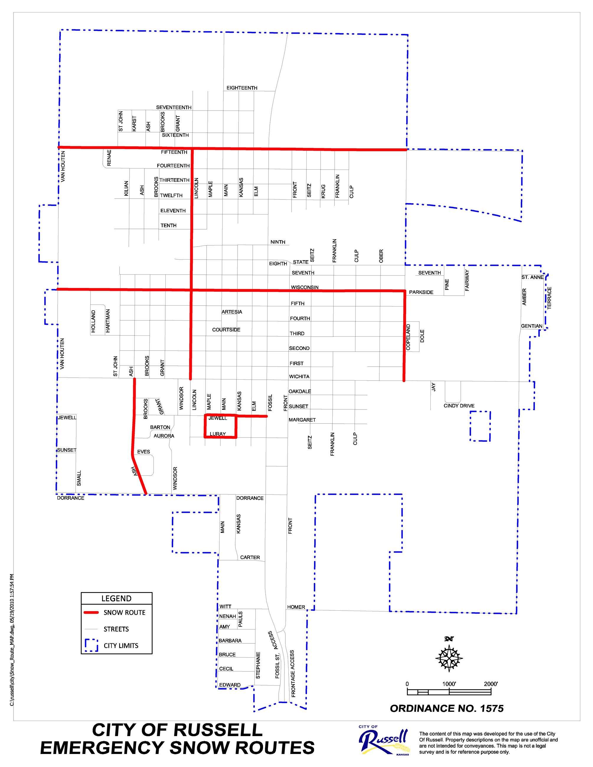 As a result of a forecasted snowstorm and snowstorms impeding traffic and causing difficulty in the clearance of streets, parking upon the following listed streets, designated as emergency snow routes, in the City of Russell is prohibited beginning at 6 am, November 25, 2023, and until further notice.
