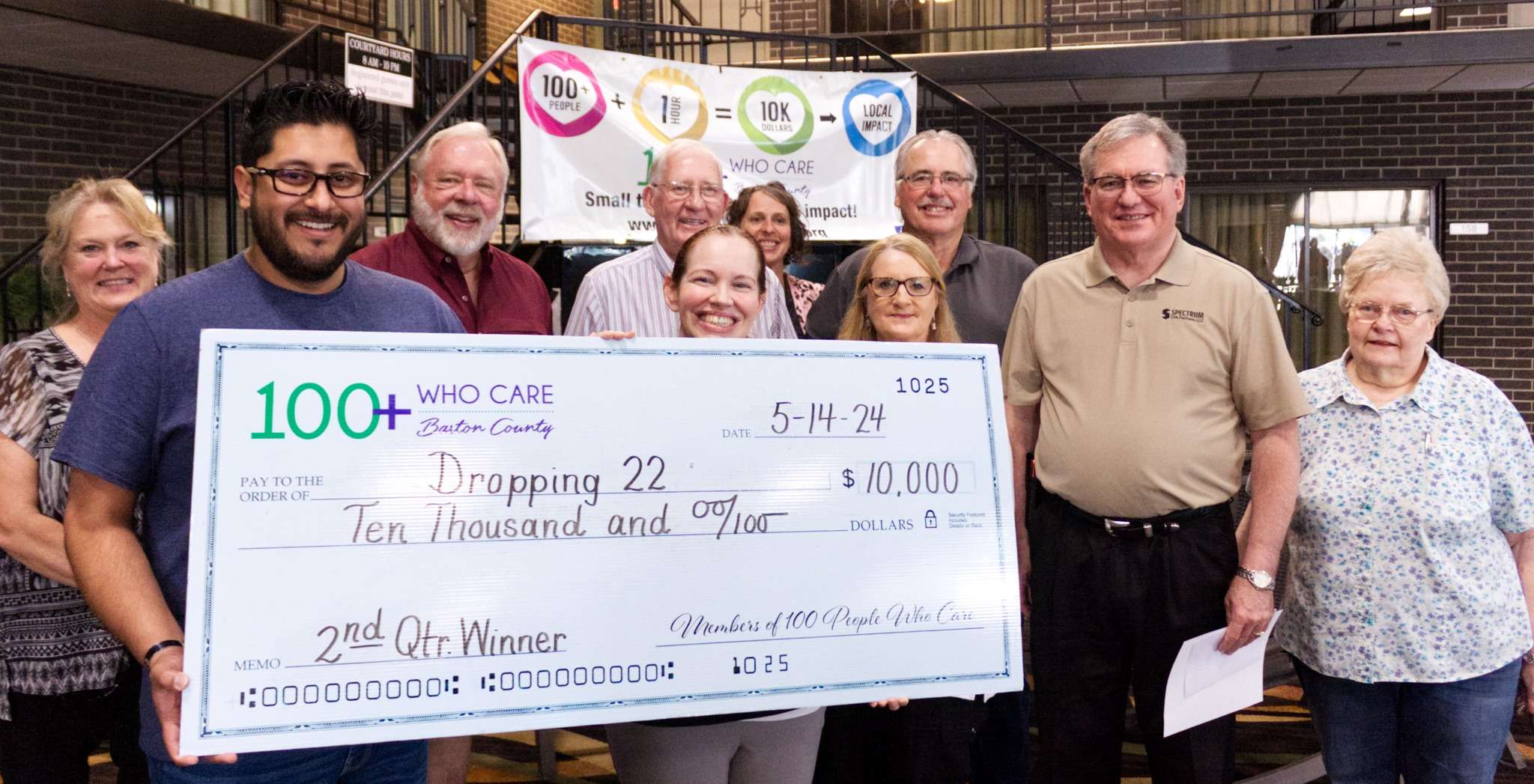 To learn more about Dropping 22, please contact staff at (620) 786-0687, visit their website at https://dropping22.org and be sure to like the organization’s Facebook page. The next giving meeting for the 100+ People Who Care group will be held on Tuesday, August 13th, 2024, at 5:30 p.m., at the Best Western Angus Inn Courtyard. At that time, representatives from Dropping 22 will return to provide an update on how they have been utilizing their donation. Members will also vote to select and nominate local, charitable organizations to receive future funds. More details can be found on the group’s website, www.100bartoncounty.org, or on their Facebook page.