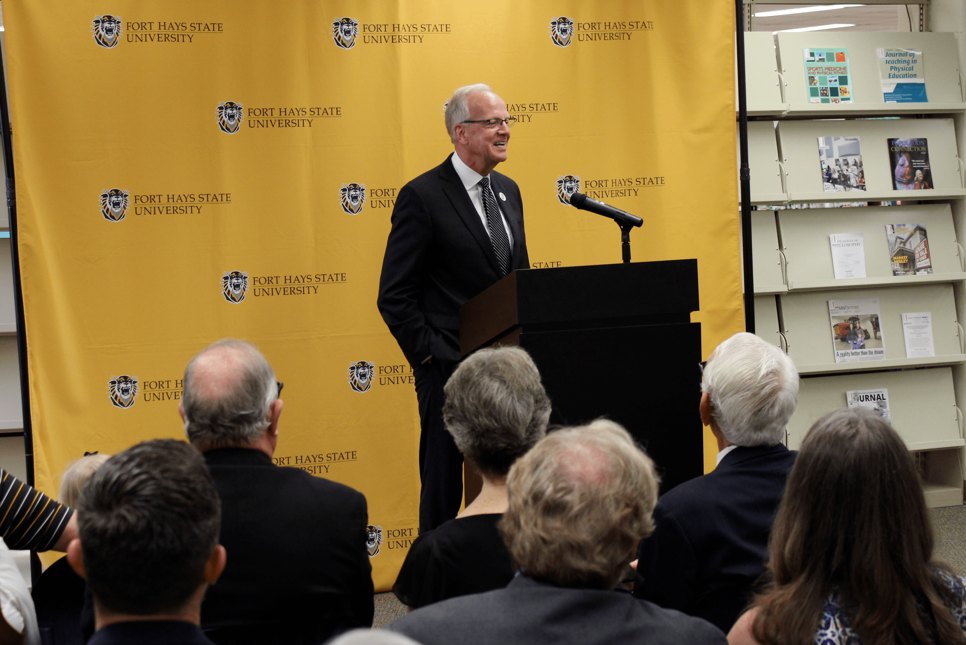 Moran shared his memories of growing up in Plainville, frequently visiting the old Forsyth Library and Sternberg Museum of Natural History, and being the first non-high school graduate to attend summer school at FHSU. Moran also spoke about the importance of the role FHSU plays in Western Kansas. He shared his belief that Western Kansas's prosperity greatly depends upon whoever is the president of FHSU.