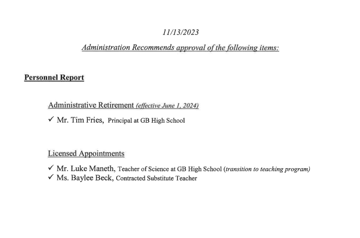 The USD 428 Board of Education accepted the retirement of Great Bend High School Principal Tim Friess, effective June 1, 2024, during Monday's meeting.
