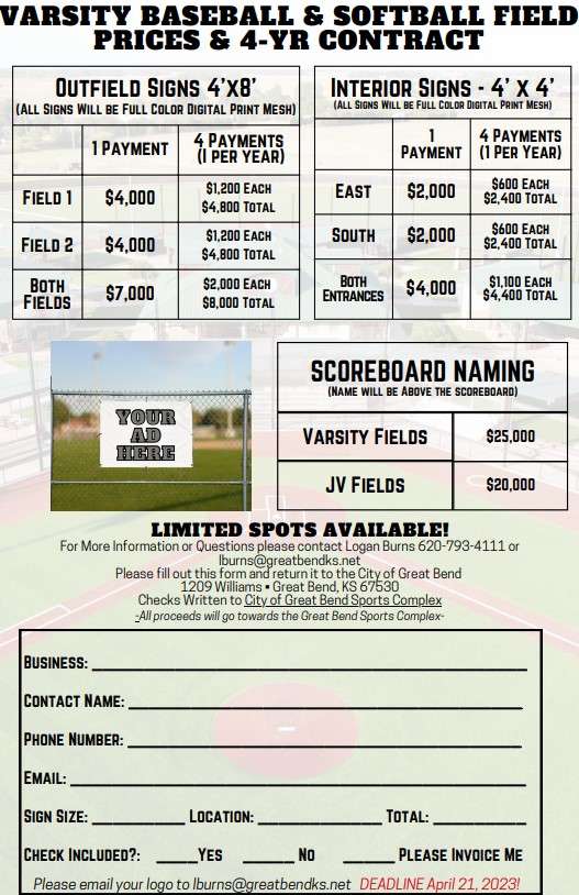 advertise their business at the Great Bend Sports Complex. Last March, the city