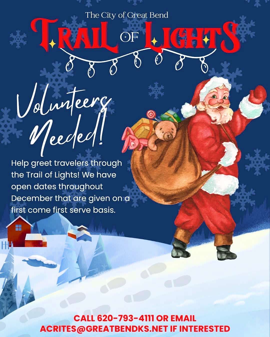 The City of Great Bend is looking for volunteers to staff the Trail of Lights Booth at Brit Spaugh Park in Great Bend. Groups of at least two people are needed to great visitors as they drive through the park, keep track of the number of vehicles, pass out goodie bags and make a note of which county and state the vehicles are from. Workers are needed every evening from 6 until 8 p.m. through December 23rd. To find out more, call (620) 793-4111 or send an email to: [email protected]