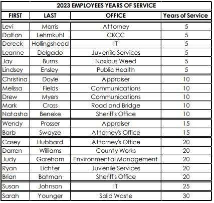 In all, the 20 employees celebrating milestones have accumulated 265 years of service to the county. Sarah Younger with the solid waste department has been employed with Barton County for 30 years. Susan Johnson was recognized for 25 years with the IT department. Five employees reached milestones of 20 years.