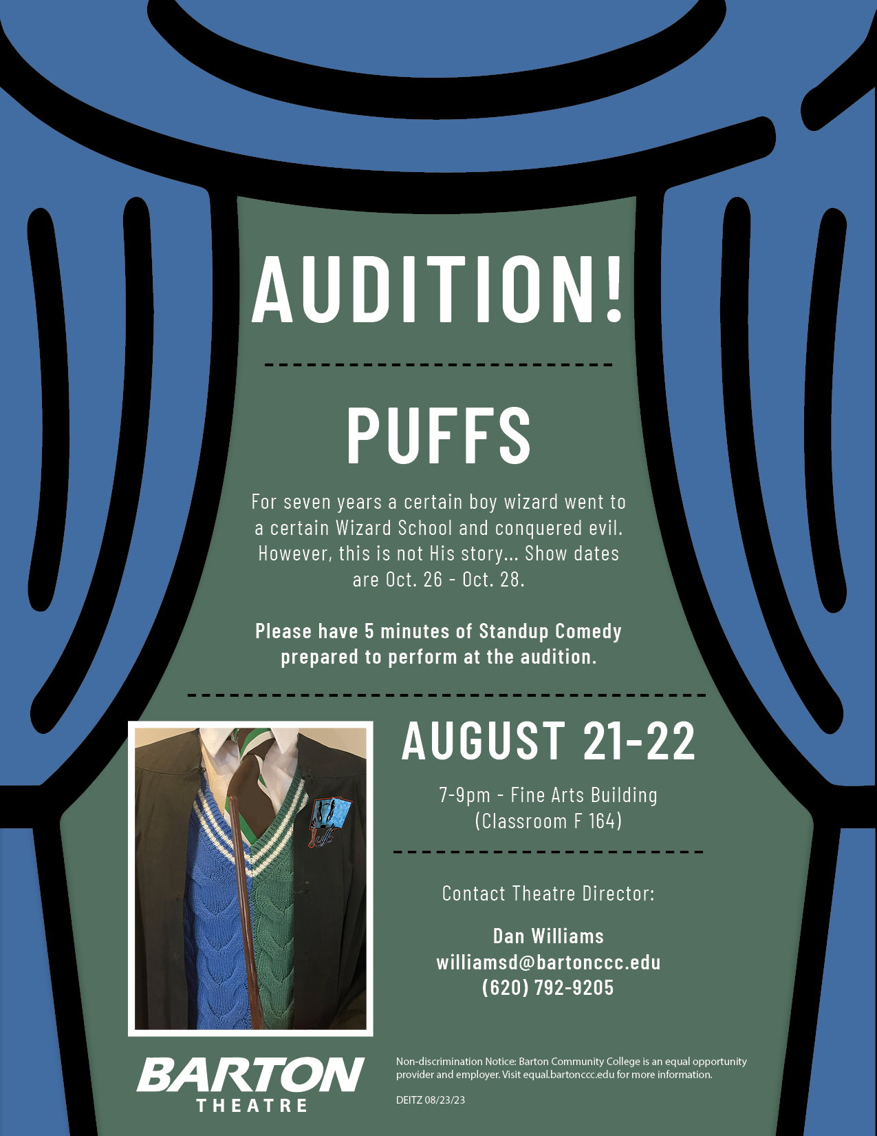The Barton Community College Theatre Department will hold auditions for its fall production of the wizard-inspired play “Puffs” Aug. 21-22 from 7-9 p.m. in the Fine Arts Building, room F-164. All roles and technical positions will be cast.