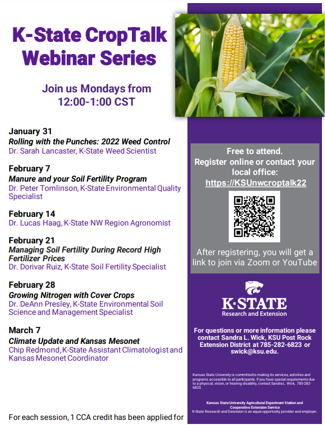 Join us for an ONLINE agronomy series, “Crop Talk”, slated to begin Monday, January 31 through Monday, March 7, 2022. This educational series is hosted by NC and NW Extension Districts and counties of K-State Research and Extension and will highlight several topics important to crop producers. These will be on Mondays and each session will be held from Noon to 1:00 p.m. CST.
