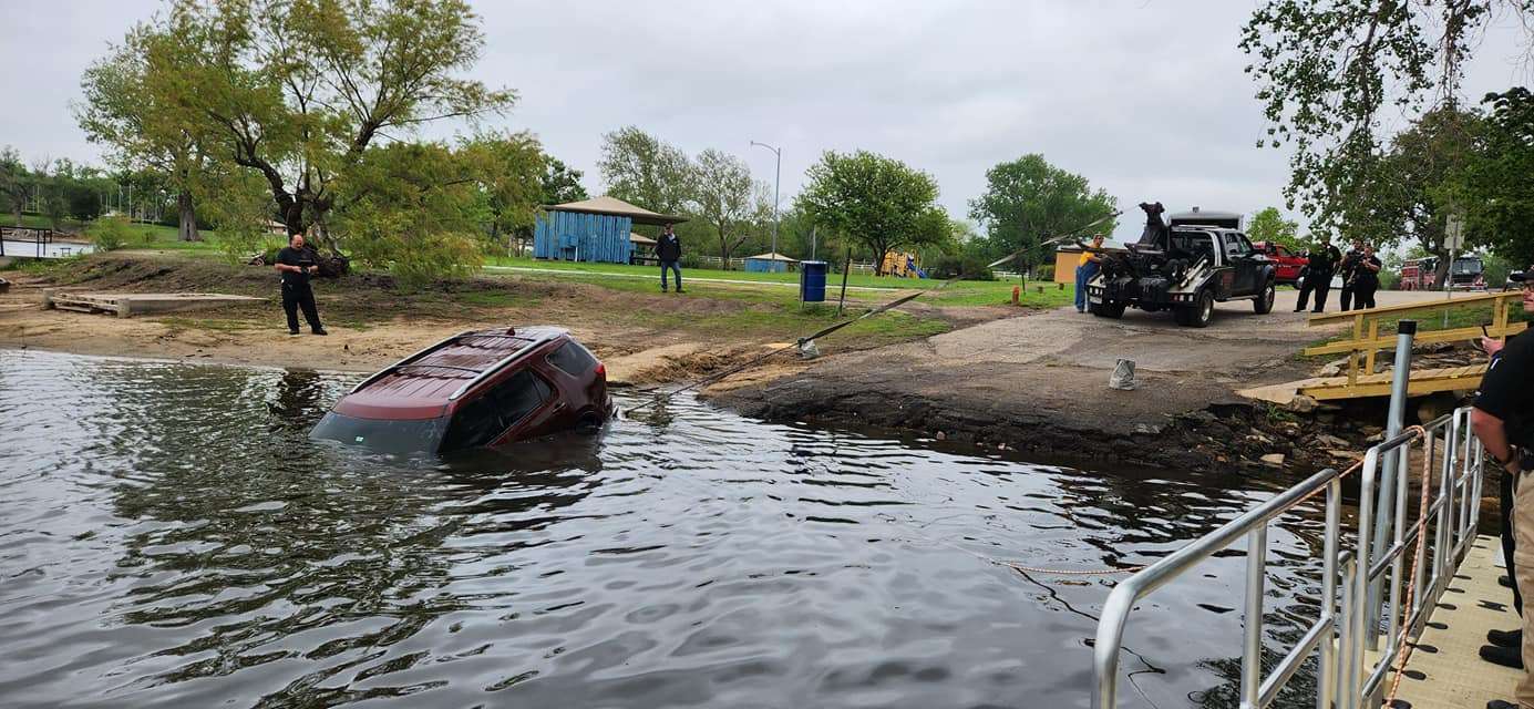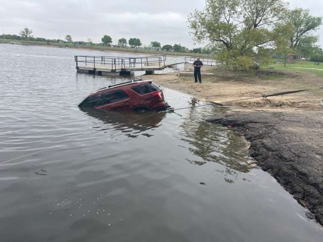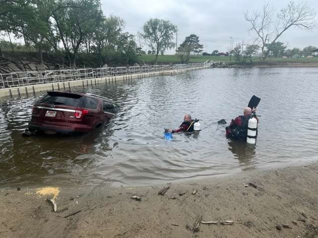 The Great Bend Fire Department was asked by the Great Bend Police Department if they could assist with a vehicle recovery from Veterans Lake. At approximately 8:30 a.m. Tuesday, May 16, members of the Fire Department dive rescue team arrived at the boat ramp, deployed divers and successfully located the vehicle.